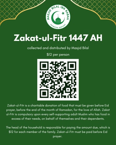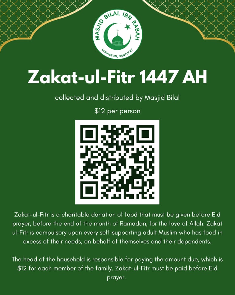 The head of the household is responsible for paying the amount due, which is $12 for each member of the family. Zakat-ul-Fitr must be paid before Eid prayer. Scan the QR code or click here to pay.