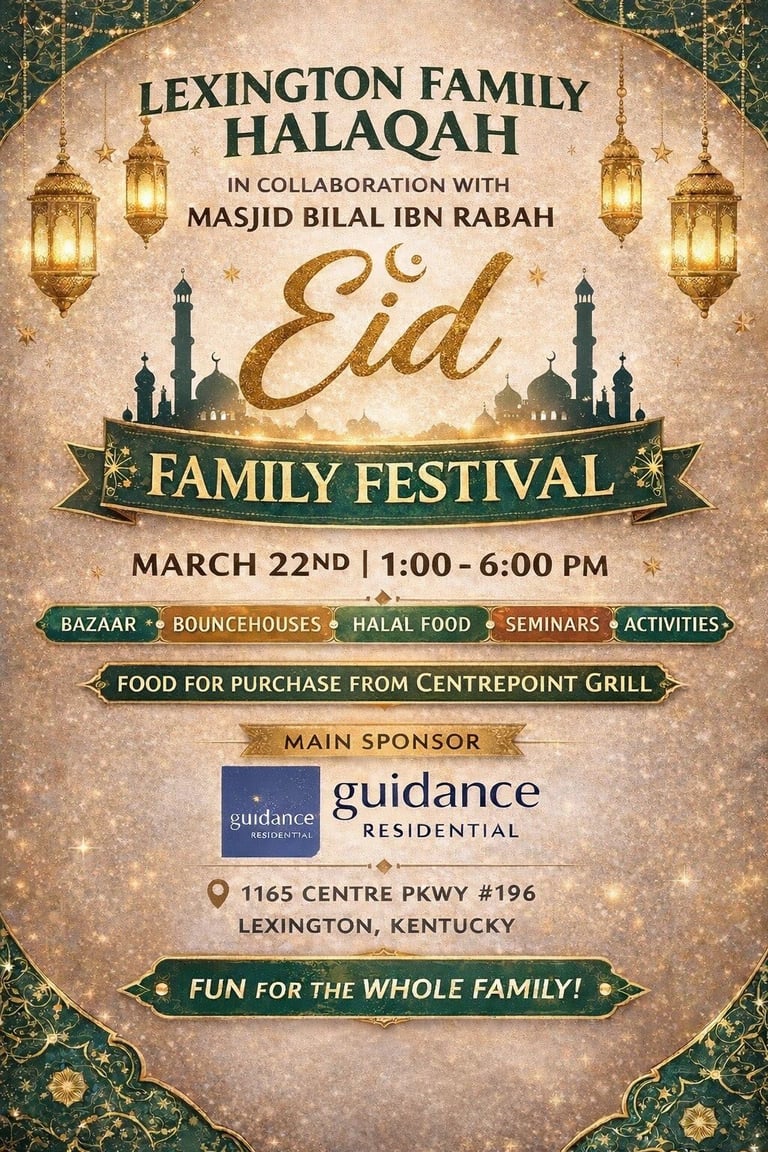 Lexington Family Halaqah and Masjid Bilal are pleased to invite you and your family to celebrate Eid al-Fitr at the Eid Family Festival this year! Join us at Centrepoint Grill on Sunday, March 22, from 1-6 PM to celebrate with the community! There will be food, games, bouncy houses, a bazaar, and more! We hope to see you there, inshaAllah!