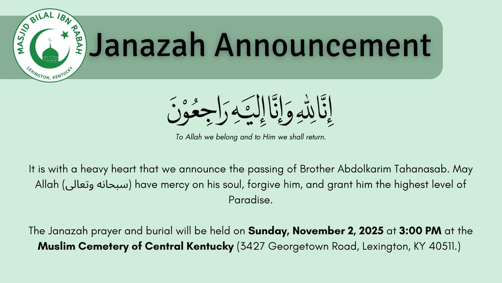 The Janazah prayer and burial will be held on Sunday, November 2, 2025 at 3:00 PM at the Muslim Cemetery of Central Kentucky (MCCK), 3427 Georgetown Rd, Lexington, KY 40511.